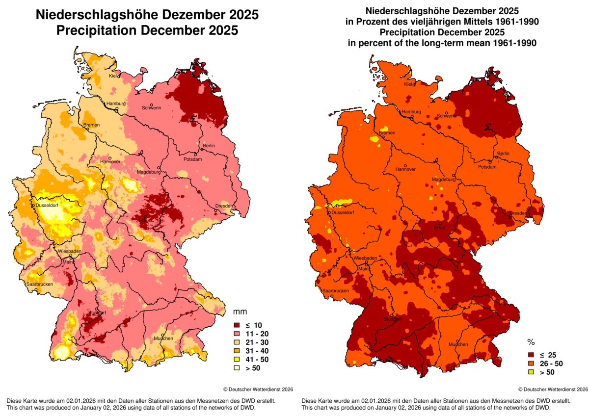 Der letzte Monat des Jahres war ungewöhnlich trocken und gehört sogar zu den zehn trockensten Dezembermonaten seit Beginn der Aufzeichnungen. In Süddeutschland und im Nordosten kam meist weniger als 25 Prozent der Mittelwerte zusammen. Lediglich im Nordwesten und Westen fiel örtlich mehr als die Hälfte der Mittelwerte. Im deutschlandweiten Flächenmittel kam gerade mal ein Drittel der durchschnittlichen Mengen zusammen. Dabei war die erste Dezemberwoche noch recht nass und die höchste Tagessumme wurde am 07.12. mit 63,5 Liter pro Quadratmeter in Sankt Blasien-Menzenschwand im südlichen Schwarzwald gemessen.