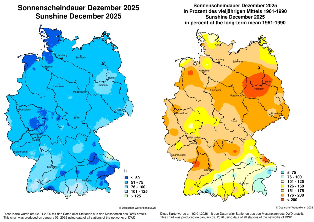 In den meisten Regionen war der Dezember 2025 ausgesprochen sonnig. Übertroffen wird er in der bis 1951 zurückreichenden Messreihe nur durch den Dezember 1972. Verbreitet betrug der Sonnenscheinüberschuss mehr als 50 Prozent, in Berlin und Teilen Brandenburgs schien die Sonne sogar mehr als doppelt so lang wie im Mittel. Lediglich in Südbayern war es unter Hochnebel gebietsweise grauer als im Durchschnitt.