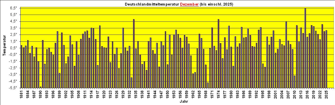 Im Vergleich zum Mittel der Jahre 1991 bis 2020 lag der Dezember 2025 nach Messwerten des Deutschen Wetterdienstes im deutschlandweiten Flächenmittel 1,3 Grad über dem Mittelwert und 2,3 Grad über dem Mittel der kühleren Periode 1961 bis 1990. Meist lagen die Abweichungen zwischen 1 und 3 Grad, in Schleswig-Holstein verbreitet noch darüber. Dabei gelangte in den ersten drei Wochen zeitweise fast frühlingshaft milde Luft nach Mitteleuropa, in der am 09. Dezember in Hechingen (Baden-Württemberg) mit 17,1 Grad der höchste Wert des Monats gemessen wurde. Dann kam der jähe Absturz und an den beiden Weihnachtsfeiertagen wurden gebietsweise zweistellige Minusgrade gemessen. In Königshütte im Ostharz wurde am Morgen des 26.12. ein Tiefstwert von -12,7 Grad registriert.