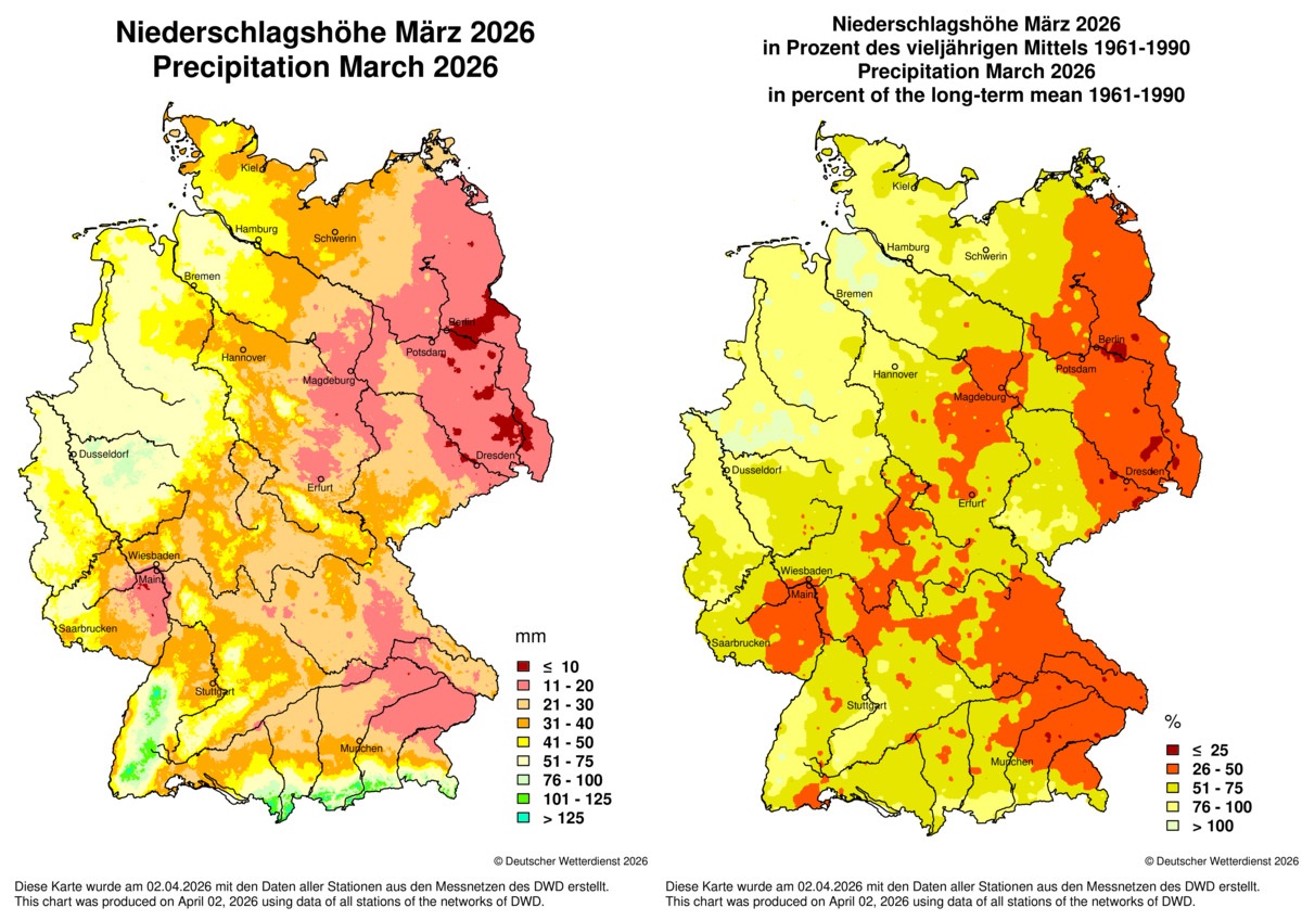 Der März 2026 war geprägt durch mehrere Trockenphasen mit viel Sonnenschein. Daher fiel die Niederschlagsbilanz in weiten Landesteilen negativ aus. Im deutschlandweiten Flächenmittel fehlten etwa 35 Prozent vom Mittelwert. Besonders trocken war der März im Osten des Landes, wo gebietsweise nicht einmal 10 Liter pro Quadratmeter zusammenkamen. Daher stieg hier die Waldbrandgefahr zeitweise schon auf die zweithöchste Stufe. Etwas stärkere Niederschläge fielen in den letzten zehn Tagen des Monats. Die höchste Tagessumme wurde am 25. in Utzenfeld im Südschwarzwald (Baden-Württemberg) mit 35,2 Liter pro Quadratmeter gemessen.