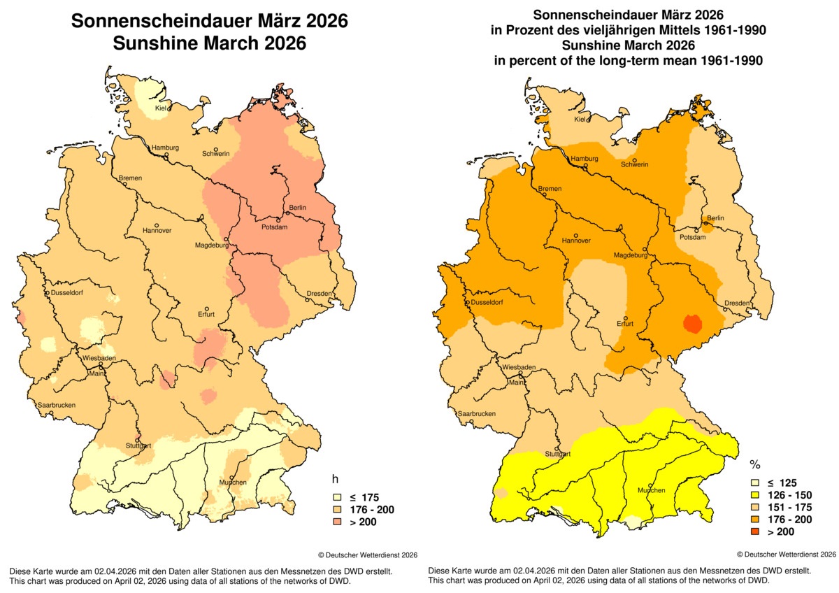 Ungewöhnlich viel Sonnenschein konnten die Messgeräte im März registrieren. Nach 2022 war es der zweitsonnigste März seit Beginn der regelmäßigen Aufzeichnungen im Jahre 1951. Dabei wurde das deutschlandweite Flächenmittel um mehr als 50 Prozent überboten, das Mittel der Jahre 1961 bis 1990 sogar um rund 75 Prozent. Etwas geringer fielen die Abweichungen im äußersten Norden, im südlichen Baden-Württemberg und in Südbayern aus.