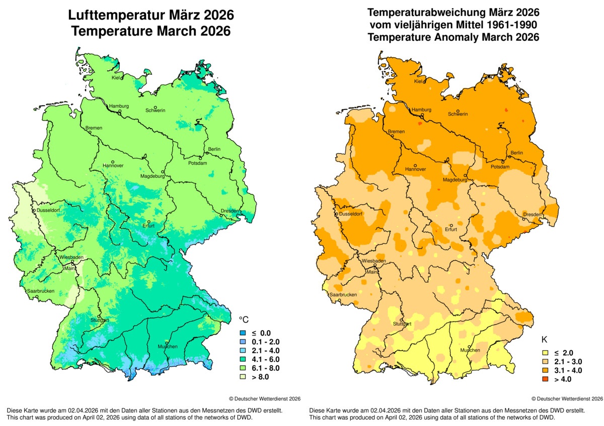Im Vergleich zum Mittel der Jahre 1991 bis 2020 lag der März 2026 nach Messwerten des Deutschen Wetterdienstes meist 1 bis 2,5 Grad über den Mittelwerten. Vor allem die erste Märzhälfte erinnerte eher an das durchschnittliche Temperaturniveau einer zweiten Aprilhälfte. Damit startete der Frühling 2026 schon durch, bevor er im Kalender beginnen sollte. Zum Monatsende folgte ein Kälteeinbruch mit Schnee vor allem in höheren Lagen. Die höchste Temperatur des Monats meldete am 7. Michelstadt im Odenwald (Südhessen) mit 19,9 Grad, der tiefste Wert wurde am Morgen des 28. März mit -15,5 Grad über frisch gefallenem Schnee in Oberstdorf (Bayern) registriert.