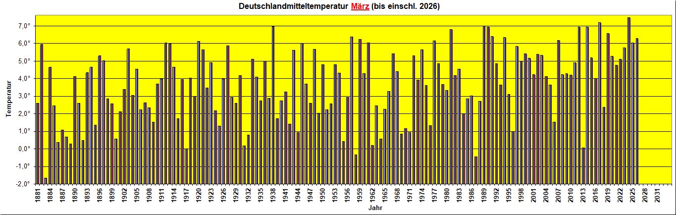 Das Deutschlandmittel lag im März 2026 bei 6,3 Grad und damit in den Top 20 der bis 1881 zurückreichenden Temperaturreihe. Das Mittel der Jahre 1991 bis 2020 liegt bei 4,6 Grad und für die kältere Periode 1961 bis 1990 bei 3,5 Grad.