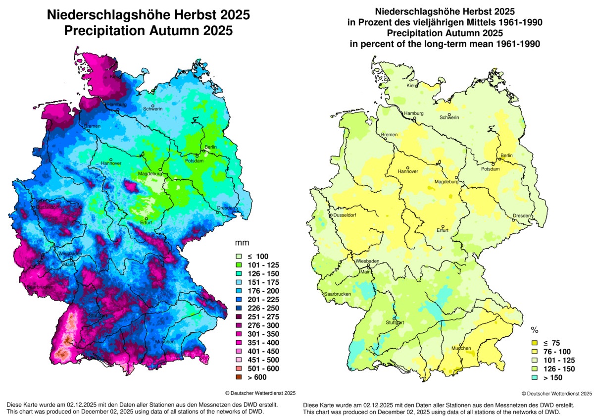 Im deutschlandweiten Flächenmittel fiel der Herbst 2025 etwas nasser aus als im langjährigen Mittel, wobei es wieder einmal große Unterschiede gab. Besonders viel regnete es gebietsweise im Nordwesten, Westen und Südwesten des Landes. In Staulagen im Schwarzwald und im Allgäu kamen örtlich mehr als 500 Liter pro Quadratmeter zusammen. Die höchste Tagessumme meldete am 08.09. Mönchengladbach-Hilderath in NRW mit 118,7 Liter pro Quadratmeter. Deutlich trockener war es im Osten Deutschlands.
