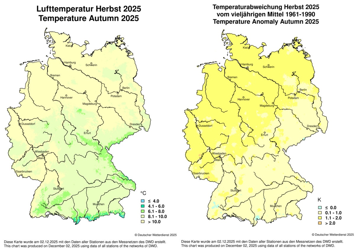 Im Vergleich zum Mittel der Jahre 1991 bis 2020 lagen die Temperaturen im Herbst 2025 im landesweiten Mittel nach Messwerten des Deutschen Wetterdienstes nur wenige Zehntel über den langjährigen Mittelwerten. Im Vergleich zur kühleren Periode 1961 bis 1990 war es fast 1 Grad wärmer. Besonders groß waren die positiven Abweichungen in der Nordwesthälfte Deutschlands. Geringfügig kühler als im Mittel war der Herbst im Südschwarzwald und im Allgäu. Sehr auffällig ist, dass zwischen der höchsten Temperatur des Herbstes und dem tiefsten Wert mehr als 50 Grad liegen. Der höchste Wert wurde am 20. September mit 32,6 Grad in Pabstorf im Harzkreis (Sachsen-Anhalt) gemessen, der niedrigste mit dem ungewöhnlichen Kälteeinbruch in der zweiten Novemberhälfte. Am Morgen des 23.11. gab es in Oberstdorf im Allgäu sehr strengen Frost bis -18,5 Grad. Überhaupt stellte sich zu der Zeit im Südosten Deutschlands verbreitet strenger Frost ein, wie er eher im Hochwinter üblich ist.