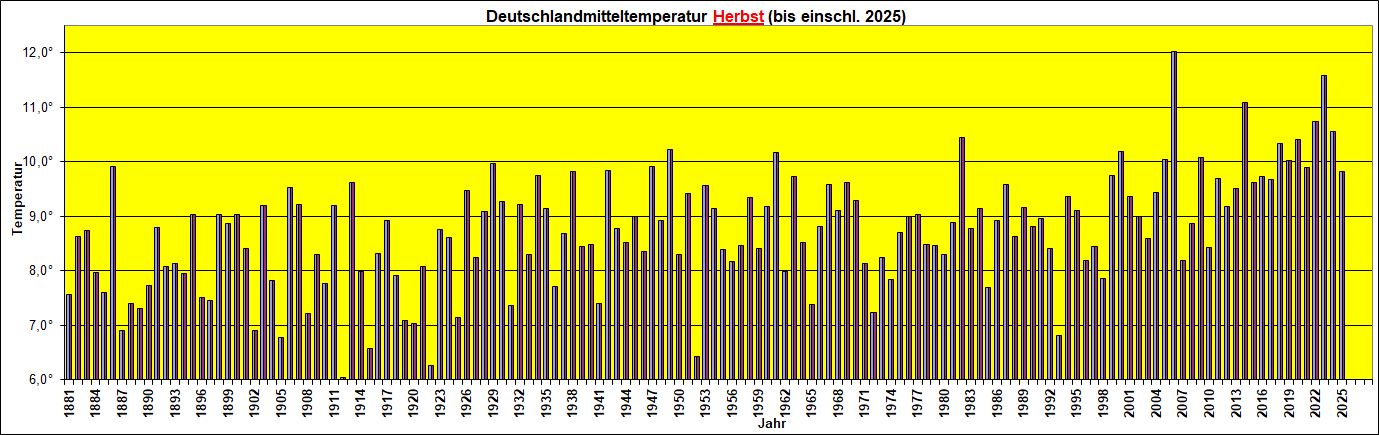 Das Deutschlandmittel lag im Herbst 2025 bei 9,7 Grad und damit im Mittelfeld der bis 1881 zurückreichenden Temperaturreihe. Die Temperaturen lagen 0,3 Grad über dem Mittel der Jahre 1991-2020 (9,4 Grad) und 0,9 Grad über dem Mittel der Periode 1961-1990 (8,8 Grad).