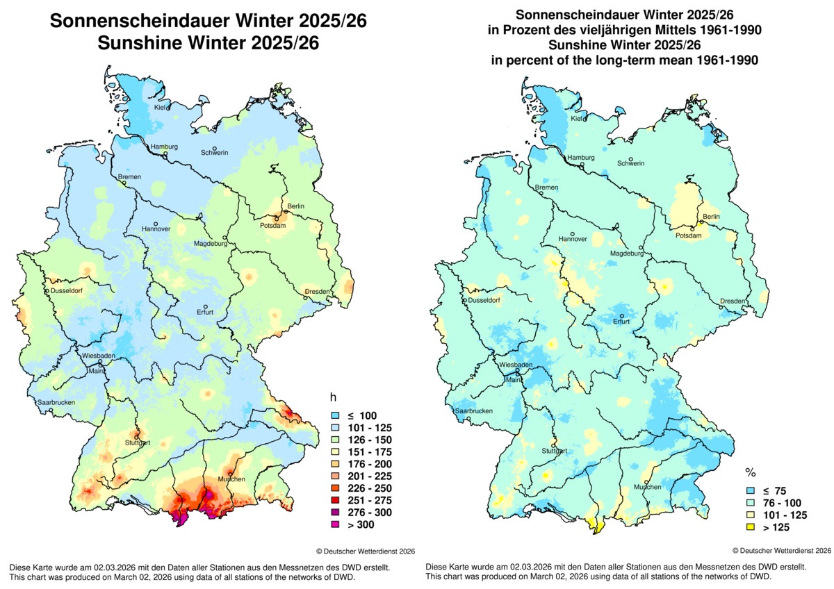 Insgesamt war der Winter 2025/26 gebietsweise etwas sonniger als im langjährigen Mittel. Dies lag vor allem an dem zweitsonnigsten Dezember seit Aufzeichnungsbeginn im Jahre 1951. Auch der Januar trug noch einiges zur Sonnenscheinbilanz bei, wogegen der Februar über längere Strecken fast ein Totalausfall war. Erst mit der vorfrühlingshaften Milderung zum Monatsende kamen doch noch einige Sonnenstunden zusammen.
