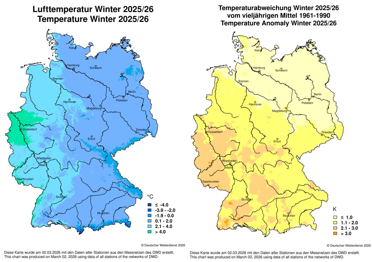 Auch der Winter 2025/26 fiel milder aus als im langjährigen Mittel, es war bereits der 15. Winter in Folge mit überdurchschnittlichen Temperaturen. Allerdings stellten sich vor allem im Januar auch winterliche Abschnitte mit Schnee und Frost ein – dies besonders im Norden und Nordosten Deutschlands. Gebietsweise wurden so viele Tage mit einer Schneedecke gezählt wie seit 15 Jahren nicht mehr. Der Winter endete furios mit vorfrühlinghaftem Wetter: Am 27. Februar wurde vielerorts die 20-Grad-Marke geknackt und der bisherige, bundesweite Temperaturrekord nur denkbar knapp verfehlt. Insgesamt war der Winter nicht nur milder, sondern auch größtenteils trockener und trotz des eher trüben Februar sonniger als im Mittel.