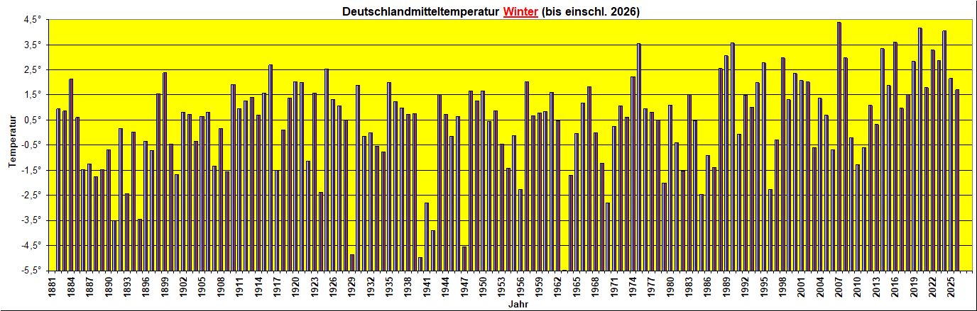 Im Vergleich zum Mittel der Jahre 1991 bis 2020 lagen die Temperaturen im Winter 2025/26 nach Messwerten des Deutschen Wetterdienstes leicht über den langjährigen Mittelwerten. Verglichen mit der kühleren Periode 1961-1990 war es allerdings deutlich milder. Es war ein wechselhafter Winter mit sehr unterschiedlichen Witterungsabschnitten. Der Januar war im deutschlandweiten Flächenmittel der kälteste seit 2017 und an den Küsten von Nord- und Ostsee sowie in den Binnengewässern wurde der Schiffsverkehr durch Eisbildung zum Teil erheblich behindert. Die tiefste Temperatur des Winters wurde am Morgen des 06. Januar in Oberstdorf mit -21,7 Grad gemessen. Ende Februar taute auch der Nordosten auf und am 27. meldeten die Wetterstationen an der mecklenburgischen Ostseeküste Temperaturen bis 17 Grad – ein kurioses Bild mit dem noch vorhandenen Eis. Frühlingshaft warm war es in weiten Landesteilen. Die 20-Grad-Marke fiel unter anderen in Teilen von Baden-Württemberg, Rheinland-Pfalz, Nordrhein-Westfalen, Hessen, Thüringen, Sachsen-Anhalt und Sachsen. Zahlreiche Stationen meldeten neue Februarrekorde. In Ohlsbach im Ortenaukreis (Baden-Württemberg) wurde ein Höchstwert von 23,0 Grad gemessen. Der bisherige Rekord stammt vom 26. Februar 1900, als in Arnsberg im Sauerland mit Föhnunterstützung 24,5 Grad gemessen wurden, gefolgt von 23,1 Grad in Jena am selben Tag.