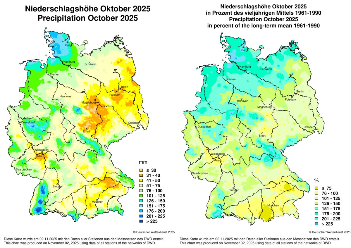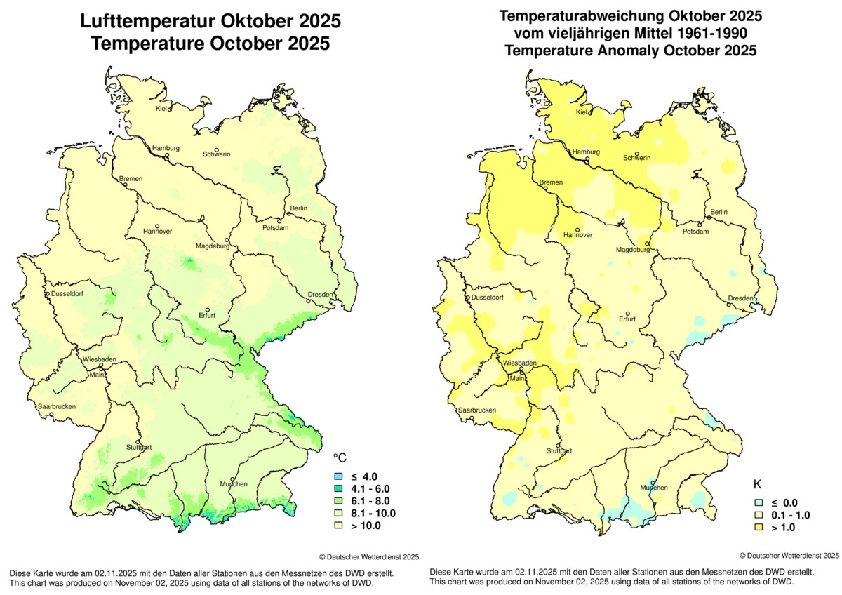 Der Oktober 2025 war insgesamt recht mild, vor allem im Nordwesten des Landes lagen die Temperaturen über dem Mittel der Jahre 1961 bis 1990 mit einem Nordwest-Südost-Gefälle. Gegenüber dercwärmeren Periode 1991 bis 2020 fielen die Abweichungen allerdings geringer aus. Die Nächte blieben im Westen weitgehend frostfrei, während sich in der Osthälfte erste Frostnächte einstellten. Die höchste Temperatur des Monats wurde am 4. in Rheinfelden (Baden-Württemberg) mit 23,4 Grad gemessen. Um die Monatsmitte setzt sich ein stabiles Hochdruckgebiet über Westeuropa fest. An seinem Rande gtldngte zeitweise Recht kalte Luft vor allem in den Nordosten und Osten des Landes. Am Morgen des 19. Oktober herrschte in der Osthälfte verbreitet Frost und in Barth (Mecklenburg-Vorpommern) wurde der bundesweite Tiefstwert von -4,7 Grad registriert. Zum Monatsende setzte sich von Südwesten erneut sehr milde Luft durch und in Trauchgau im Ostallgäu (Bayern) wurde sogar die 20-Grad-Marke geknackt.
