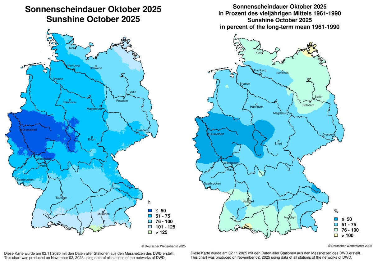 Der Oktober 2025 war in weiten Landesteilen ausgesprochen trüb. Im bundesweiten Flächenmittel wurden seit Beginn der Aufzeichnungen bisher nur 7 Oktobermonate mit weniger Sonnenschein registriert. Im Mittel wurden in diesem Oktober weniger als drei Viertel derzeit in durchschnittlichen Sonnenstunden registriert. Besonders selten schitn die Sonne im Westen. Am.Rande des westeuropäischen Hoch wehte aus Nordwesten wiederholt feuchte und wolkenreiche Luft heran.