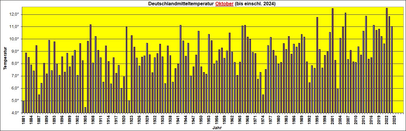 Das Deutschlandmittel lag im Oktober 2025 bei 9,9 Grad und damit im oberen Mittelfeld der bis 1881 zurückreichenden Temperaturreihe. Das Mittel der Jahre 1991 bis 2020 lag bei 9,5 Grad, in der kühleren Periode 1961 bis 1990 bei 9,0 Grad.