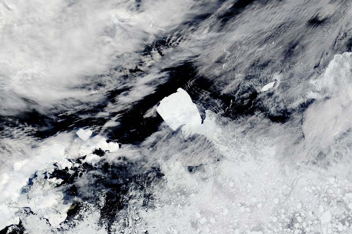 Dieses Bild, aufgenommen am 11. September 2025 vom MODIS (Moderate Resolution Imaging Spectroradiometer) auf dem NASA-Satelliten Terra, zeigt den fortschreitenden Zerfall von Eisberg A-23A. Sein größtes verbliebenes Fragment war etwas mehr als 1.500 Quadratkilometer groß – immer noch riesig und der zweitgrößte frei schwimmende Eisberg der Welt zu diesem Zeitpunkt. Allerdings hatte er bereits etwa zwei Drittel seiner Fläche verloren, seit er einige Jahre zuvor begonnen hatte, von der Antarktis nach Norden zu driften.