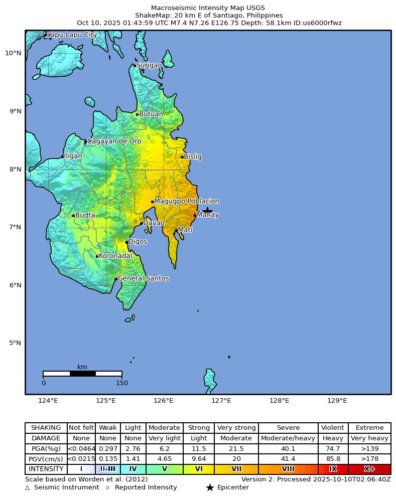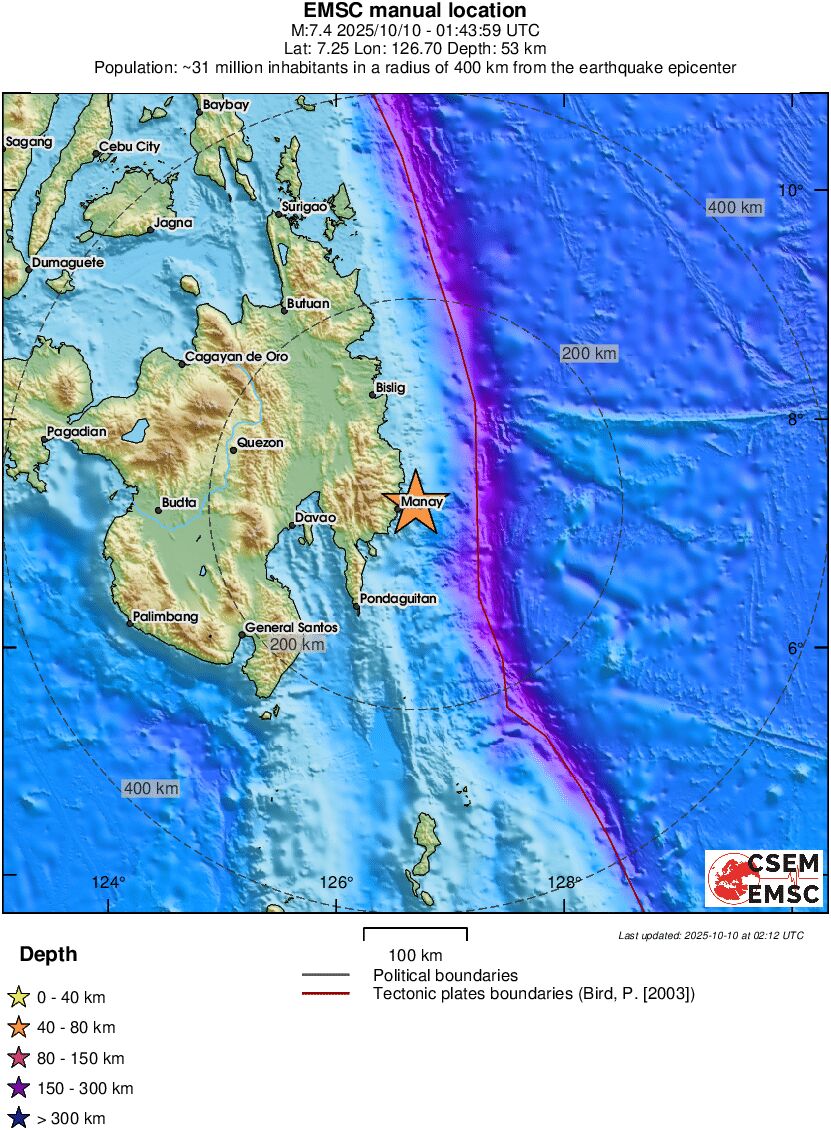 ❗️⚠️🇵🇭 – A 7.6-magnitude earthquake struck offshore in the southern Philippines on October 10, 2025, at a depth of 10 km (6 miles) off Manay town in Davao Oriental province, Mindanao region.