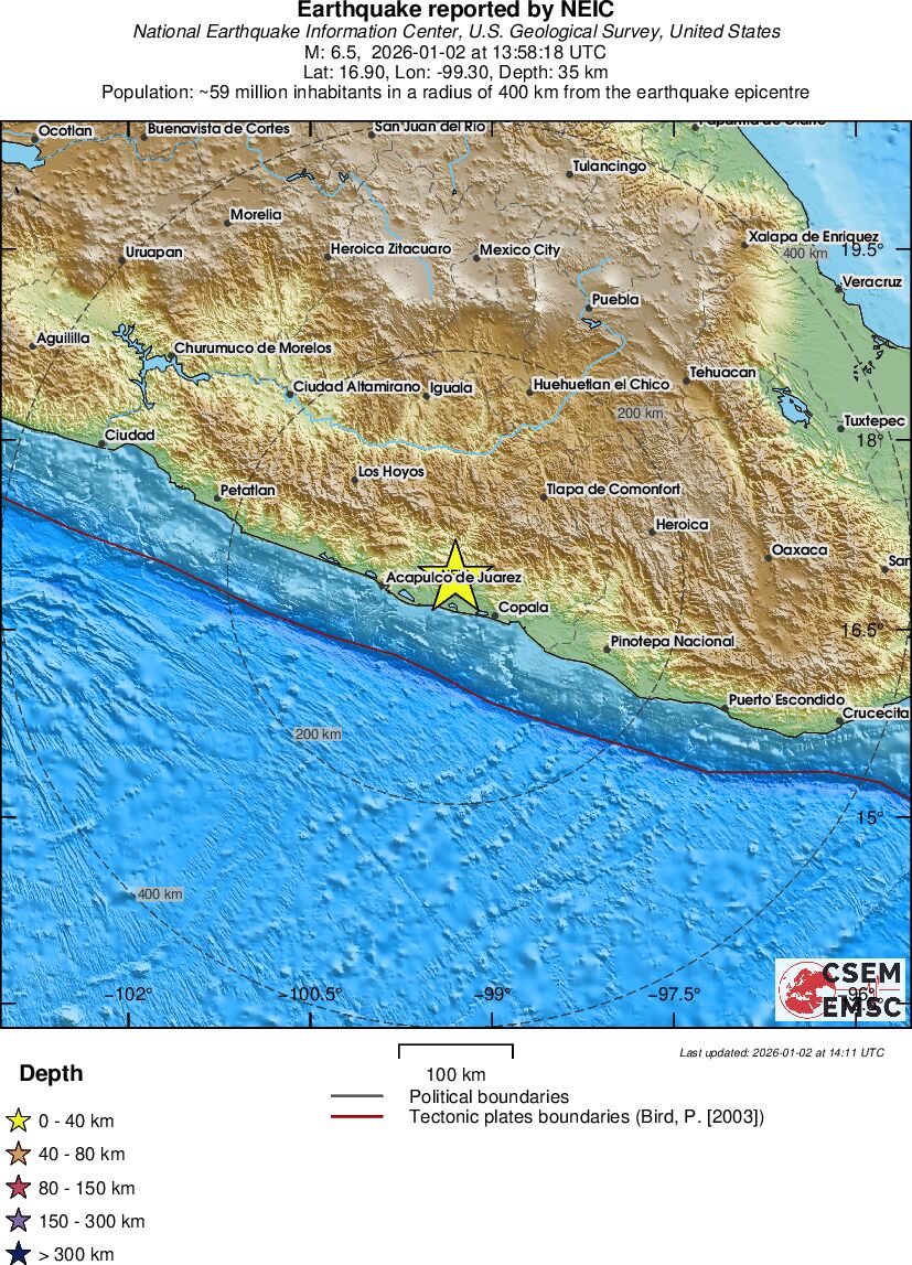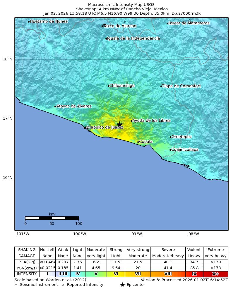 Am Freitag hat gegen 14:58 Uhr MEZ (= 07:58 Uhr Ortszeit) ein schweres Erdbeben den Süden Mexikos erschüttert. Das Beben erreichte nach vorläufigen Angaben des amerikanischen Erdbebendienstes die Stärke 6,5. Das Epizentrum lag bei dem Ort Rancho Viejo (ca. 1.100 Einwohner) im Bundesstaat Guerrero und etwa 65 Kilometer nordöstlich der Stadt Acapulco an der mexikanischen Westküste. Der Erdbebenherd befand sich 30 bis 40 Kilometer unter der Oberfläche. Größere Schäden wurden nicht gemeldet.