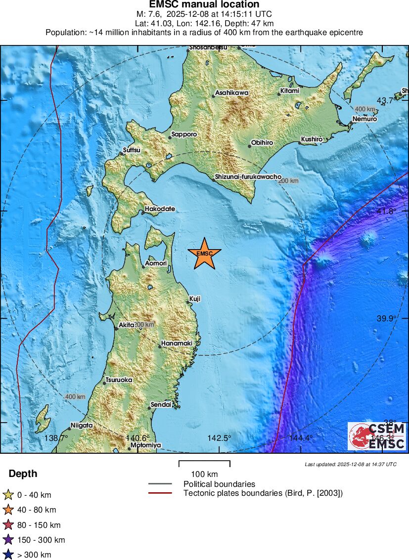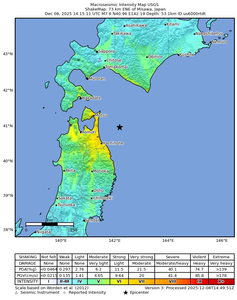 (Montag, 08.12.25) Am Montag hat gegen 15:15 Uhr MEZ (= 23:15 Uhr Ortszeit) ein sehr schweres Erdbeben den Meeresboden vor Nordjapan erschüttert. Das unterseeische Beben erreichte nach vorläufigen Angaben des amerikanischen Erdbebendienstes die Stärke 7,6. Das Epizentrum lag recht dicht vor dem Norden der Insel Honschu, etwa 75 Kilometer nordöstlich von Hachinohe (ca. 239.000 Einwohner) und etwa 600 Kilometer nordnordöstlich der japanischen Hauptstadt Tokyo. Der Erdbebenherd befand sich 45 bis 55 Kilometer unter der Oberfläche. Für den Norden Japans wurde eine Tsunamiwarnung ausgegeben. Über größere Schäden ist derzeit nichts bekannt.