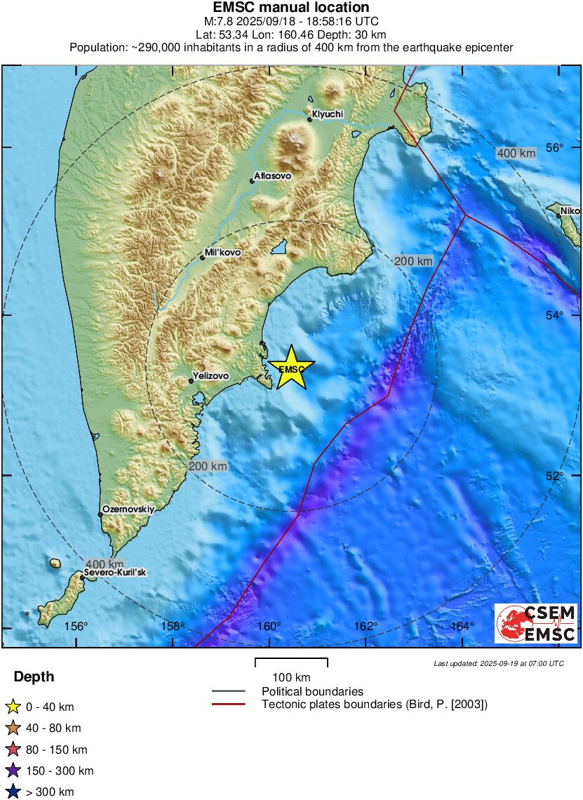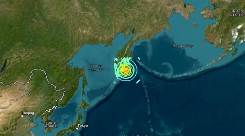 Am Donnerstag hat gegen 20:58 Uhr MESZ (06:58 Uhr Ortszeit am Freitag) erneut ein sehr schweres Erdbeben den Meeresboden vor der ostrussischen Halbinsel Kamtschatka erschüttert. Das unterseeische Beben erreichte nach vorläufigen Angaben des amerikanischen Erdbebendienstes die Stärke 7,8. Das Epizentrum lag recht dicht vor der Ostküste von Kamtschatka, etwa 130 Kilometer östlich der Stadt Petropavlovsk-Kamchatsky (ca. 181.000 Einwohner). Der Erdbebenherd befand sich rund 20 Kilometer unter der Oberfläche. Schäden oder ein Tsunami würden nicht gemeldet, eine Tsunamiwarnung konnte schnell wieder aufgehoben werden. Es handelte sich um ein Nachbeben nach dem sehr schweren Erdstoß der Stärke 8,8 am 30. Juli vor Kamtschatka.