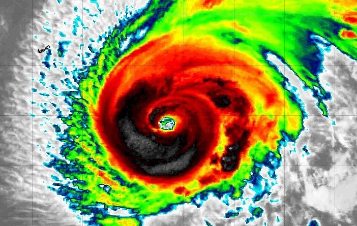 Das Satellitenbild zeigt eindrucksvoll das Auge im Zentrum des Hurrikans. Die so genannte Eyewall – der Ring um das Auge mit den stärksten Wettererscheinungen – ist dabei noch nicht in allen Teilen gut ausgeprägt.