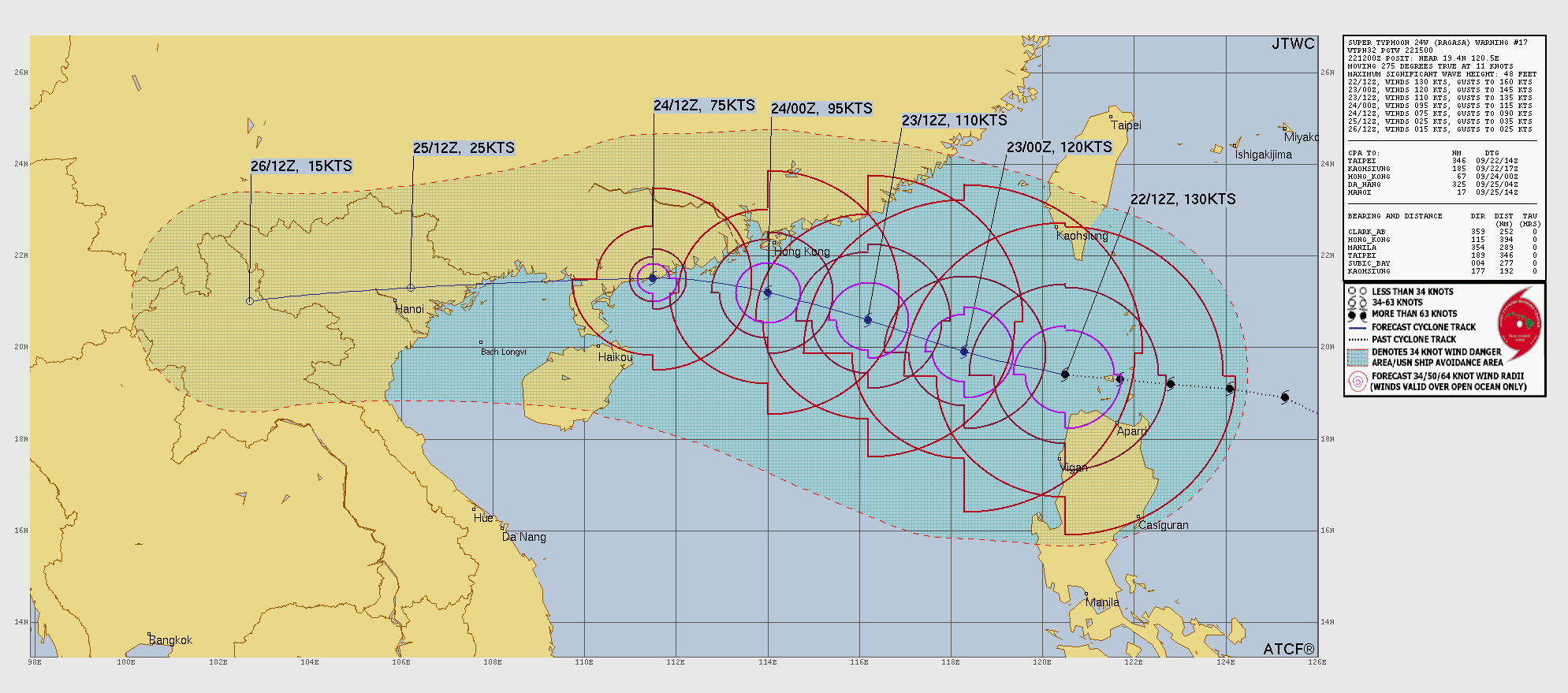 Unterdessen hat der Supertaifun RAGASA mit mittleren Windgeschwindigkeiten bis etwa 230 km/h den Norden der philippinischen Insel Luzon gestreift und zieht weiter nach Westen zum Südchinesischen Meer. Hier schwächt sich der Taifun zwar langsam ab, bleibt aber sehr gefährlich und könnte in den kommenden Tagen auf den Süden Chinas treffen. Hier drohen neben den hohen Windgeschwindigkeiten vor allem schwere Überschwemungen.